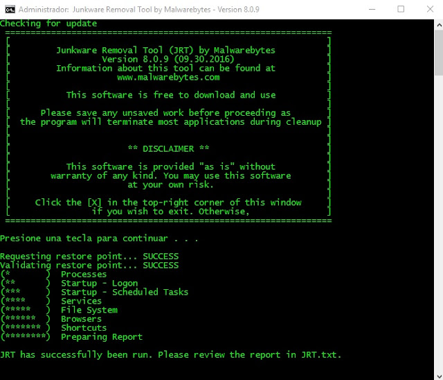 - Cuando se termine el proceso se mostrara en pantalla un informe detallado de las aplicaciones potencialmente no deseadas que ya se han eliminado y dejara un archivo llamado JRT.txt que es donde se encuentra el informe, este si lo deseas lo puede eliminar.