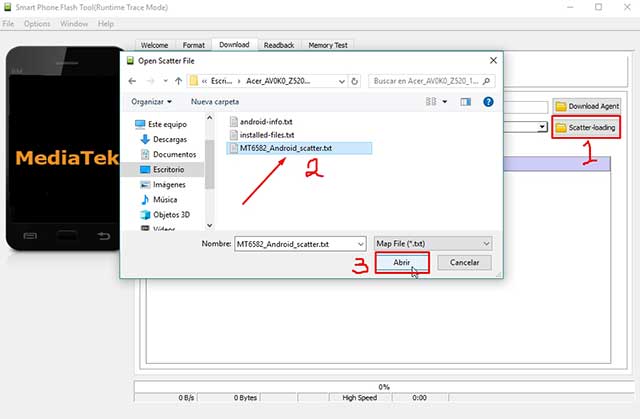 - Procede a dar clic sobre el botón que dice «Scatter-loading«. En la ventana que se abre hay que buscar el archivo parecido a esto: «MT6582_Android_scatter» el cual se encuentra dentro de la carpeta que contiene los archivos de la rom [MT6582 puede variar depende del modelo].