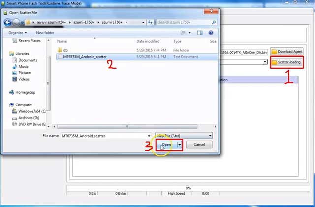 2. Ahora procede a abrir el programa Flash Tools. Una vez dentro de la herramienta hay que dar clic en la opción de «Scatter-loading«. En la ventana que se abre buscar el archivo «MT6735_Android-scatter.txt» que esta en los archivos de la rom y procede a abrir. [MT6735 varia dependiendo el modelo del teléfono].