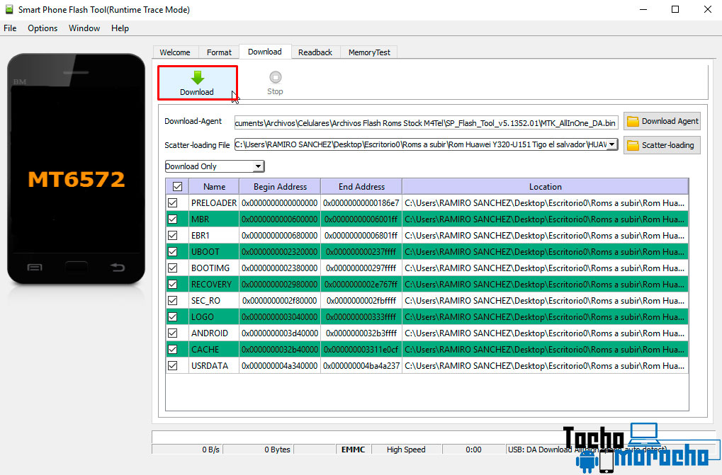 - Automáticamente se cargan los archivos de la ROM en el programa, dejamos todo como esta y procedemos a dar clic en el botón verde de la parte superior izquierda que dice «Download«. Ahora el programa está esperando a que conectemos en teléfono al PC.