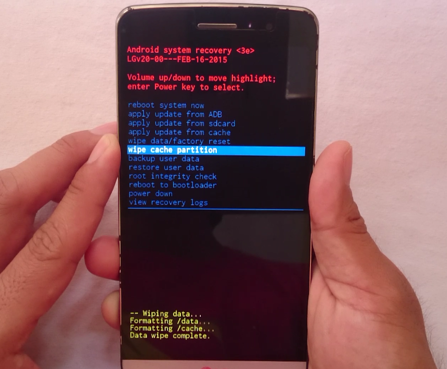 - Cuando finalice el proceso anterior nos vamos hasta la opción de «wipe cache partition» y presionar POWER. Este proceso es más rápido por lo que terminará en un instante.