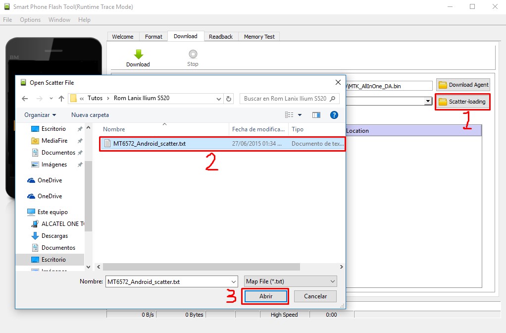 - Ejecutamos el SP Flash Tool, seleccionamos la opción de «Scatter-loading«, se nos abrirá una ventana donde hay que seleccionar el archivo Scatter que está dentro de la carpeta de la ROM.