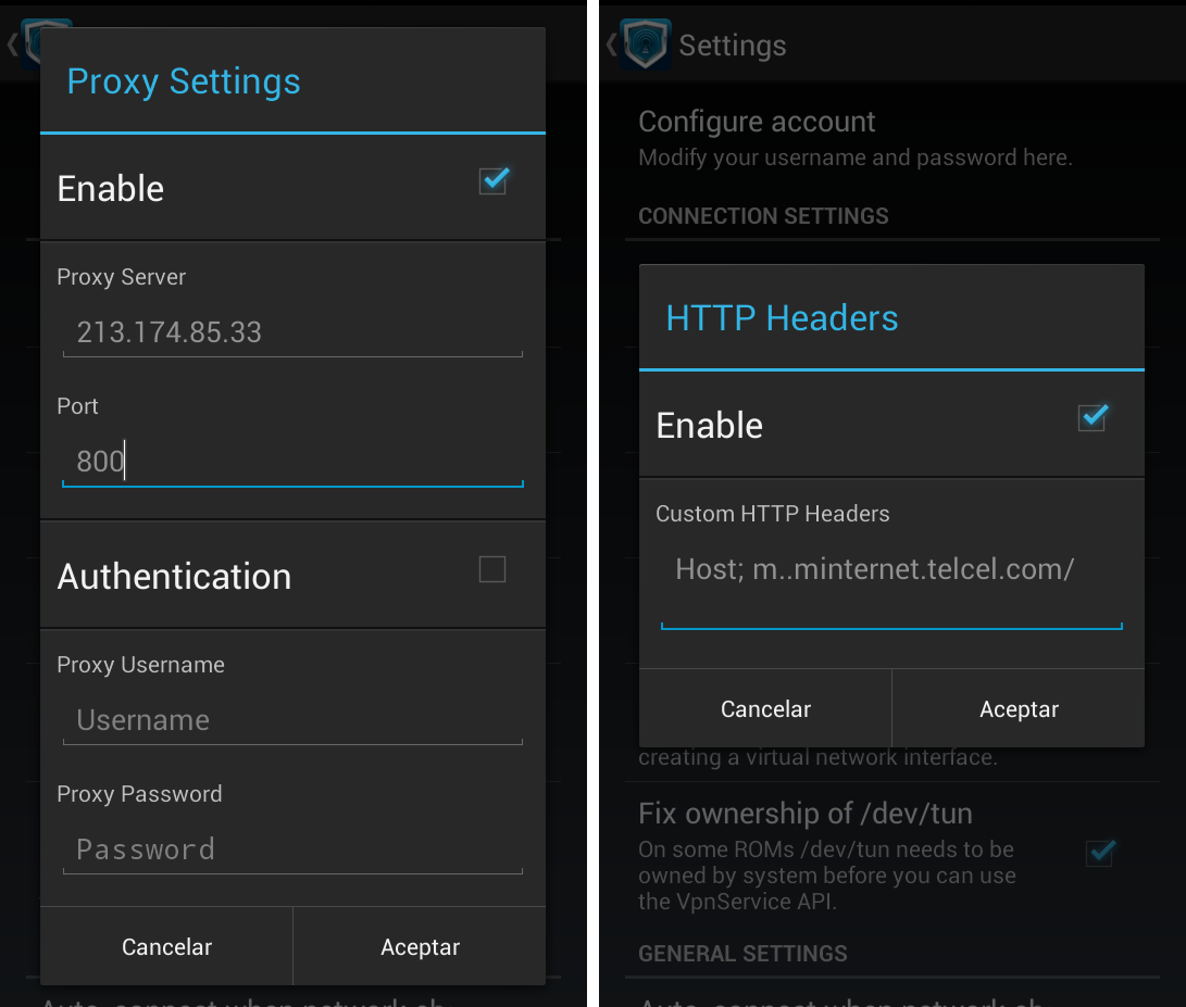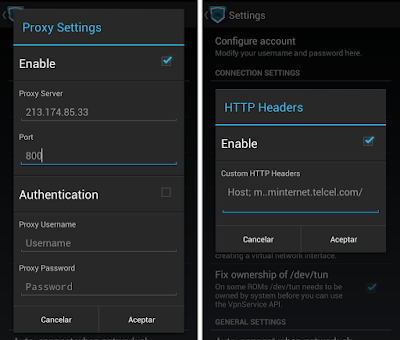Internet Gratis Telcel.1.- El APN lo dejaremos por defecto para que no muevan nada. Entramos a la aplicación DroidVPN despues en Configuraciones y realizamos los siguientes cambios: En «Connection Protocol» elegimos «TCP«.En «Port settings» ponemos lo siguiente:Set UDP Port: 8081Set TCP Port: 8080Bind to Local Port: 80812.- Vamos atrás, para configurar el «Proxy Settings«. Para poder modificar esta opción tenemos que palomear «Enable«. En el Proxy server: 213.174.85.33 y en Puerto: 800 damos en aceptar. Regresamos y entramos a «HTTP Headers» de igual forma palomeamos «Enable» para ajustar y pegar Host; m..minternet.telcel.com/ acepamos para que se guarde.3.- Nos vamos a inicio, elegimos un «Free server» y conectamos. Ya deberíamos tener Datos móviles gratis en nuestro Android.Listo!!! eso ha sito todo amigos, a disfrutar del Internet gratis en nuestro dispositivo Android y no te olvides de seguir visitando TochoMorocho.Descargar DroidVPN.Descargar Más Configuraciones APN y Puertos.