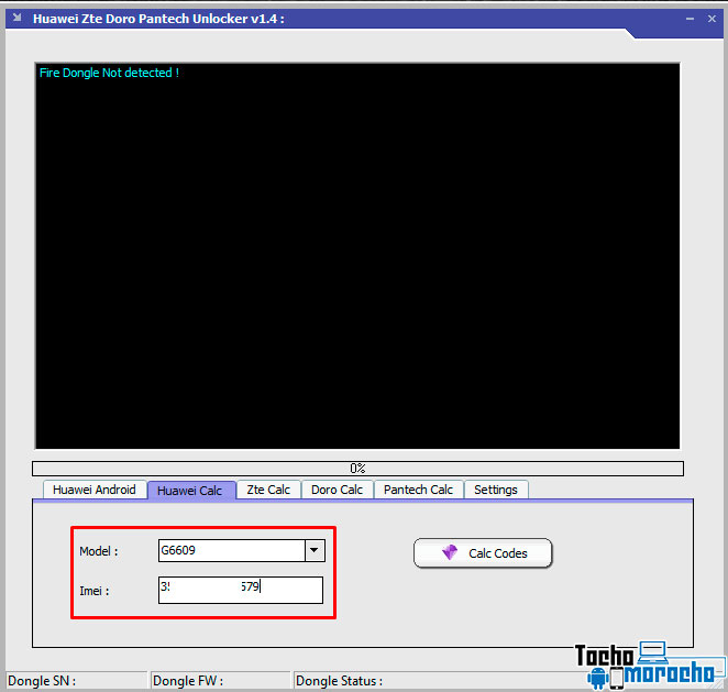 - Presiona el botón «Calc Codes» y automáticamente se mostrará en la parte de arriba tu IMEI y el NCK. El NCK consta de 8 dígitos y es el código de liberación que vamos a ocupar para desbloquear el celular Huawei.
