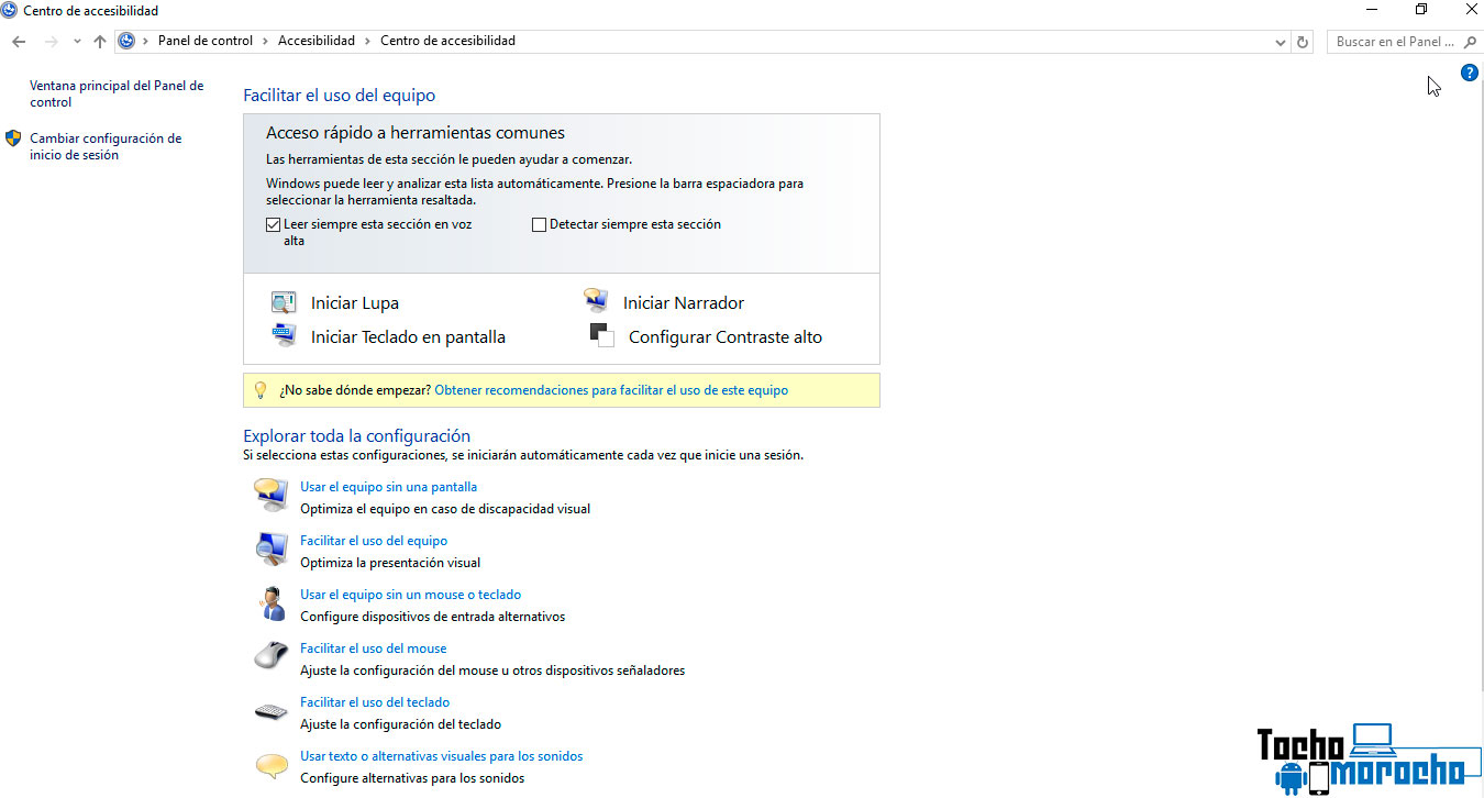 La primera opción es desactivar las animaciones de Windows 10 por completo se logra accediendo al Panel de Control. Para ello escribimos en el cuadro de búsqueda de Windows 10 «Panel de Control» o clic derecho en el botón del menú Inicio y eliges «Panel de control«. Ahí accedes al apartado de «Centro de Accesibilidad«.