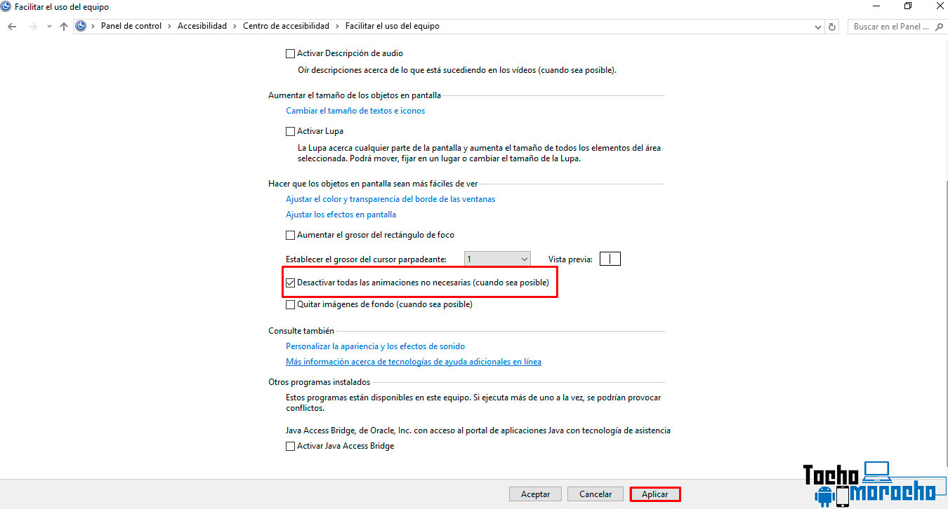 Ahora accede a la sección de «Facilitar el uso del equipo» y marca la casilla que dice «Desactivar todas las animaciones no necesarias«. Luego hacer clic en «Aplicar» y después en «Aceptar«.