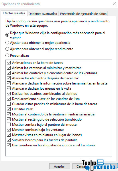 Recuerda que cuentas con dos opciones muy buenas, una es ajustar para tener la mejor apariencia y la otra Ajustar para tener el mejor rendimiento.