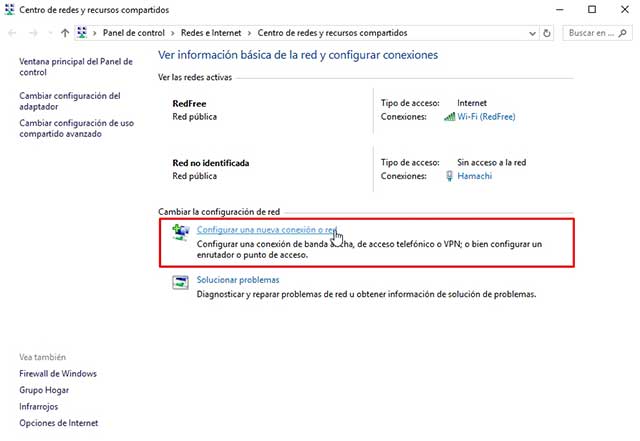 Una vez que se abra la ventana de Centro de redes y recursos compartidos en la sección de Cambiar la configuración de Red dar clic en donde dice «Configurar una nueva conexión o red«.