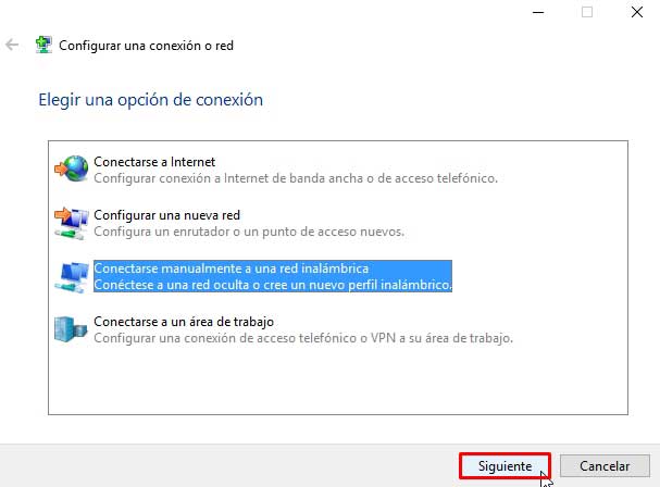 Ahora en la ventana que se muestra elegir la opción de «Conectarse manualmente a una red inalámbrica» y clic en el botón «Siguiente«.