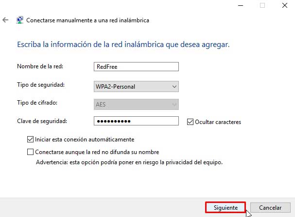 Vamos a escribir la información de la red a la cual nos vamos a conectar manualmente. Colocar el nombre de la red, tipo de seguridad y la clave para después dar clic en «Siguiente«.