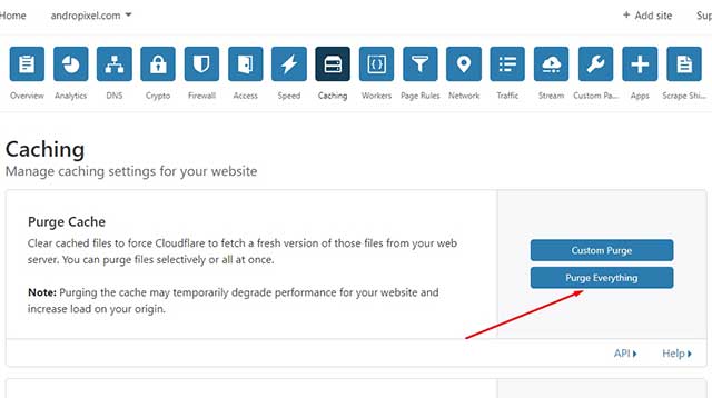- Vamos a purgar la cache, para ello nos vamos a la pestaña de «Caching«. Esto es muy fácil solo es cuestión de dar clic sobre el botón «Purge Everything» y confirmar la purga de todos los archivos en cache.