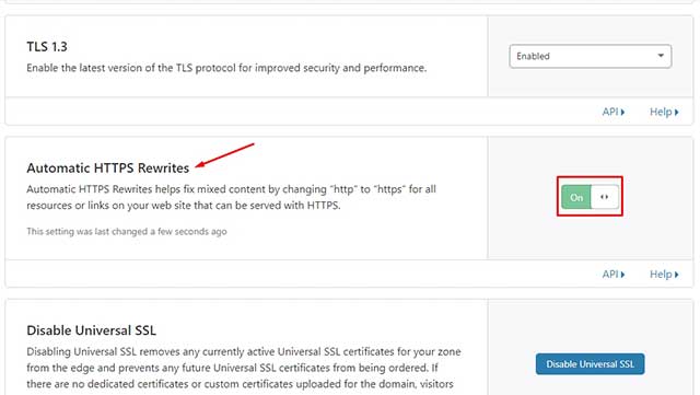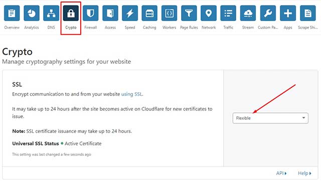 - Ahora nos vamos a la pestaña de «Crypto«. En la sección «SSL» seleccionar la «Flexible«. En la sección de «Always Use HTTPS» activamos el interruptor. Después en la sección «Automatic HTTPS Rewrites» igual activar el interruptor a «On«.
