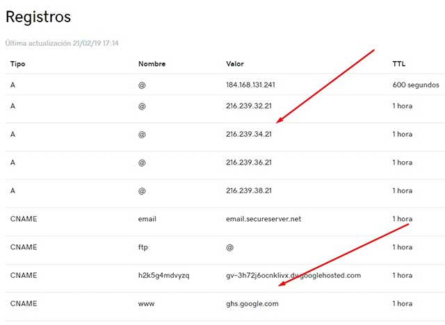 Ahora bien antes continuar cabe mencionar que el dominio esta en GoDaddy y puede que sea problema de este registrador de dominio. Pero igual me han comentado que les ha paso con otros registradores. La configuración que tengo para todos mis blogs y la que se mostró en el tutorial es la siguiente: