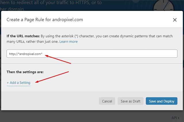 - Lo siguiente será irse a la pestaña de «Page Rules«. Aquí vamos a dar clic en el botón «Create Page Rules«. Procede a escribir la dirección url de tu dominio de la siguiente forma: http://*midominio.com* y da clic en «+ Add Setting» tal como se muestra en la imagen.