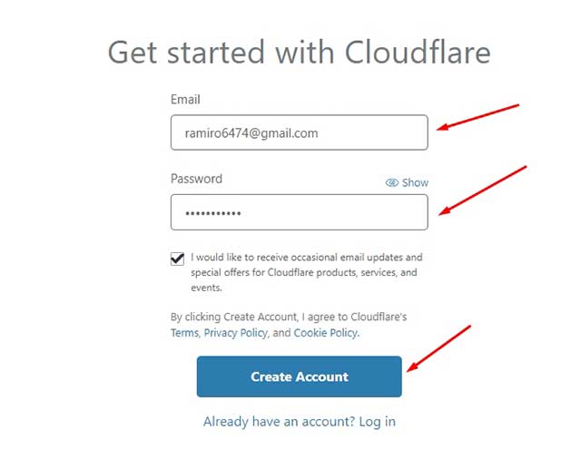 - Para llevar a cabo este proceso primero tenemos que registrarnos en la página de cloudflare. Este proceso es muy sencillo, una vez registrados confirmar la cuenta con el email que nos mandan a nuestro correo.