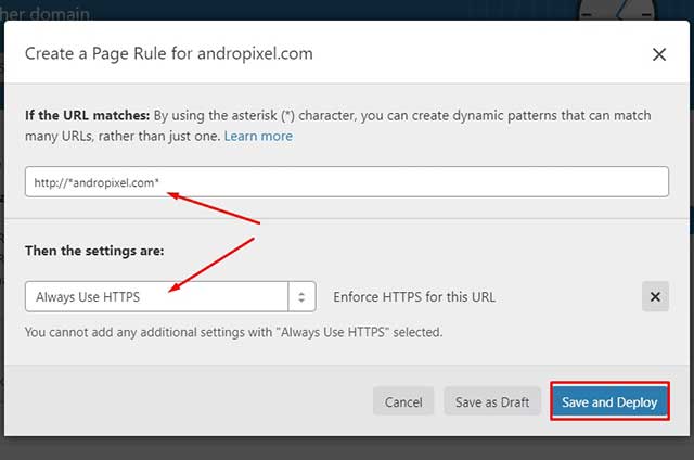 - De la lista desplegable elegir la opción de «Always Use HTTPS» y posteriormente dar clic en el botón «Save and Deploy«. Verifica que hayas configurado bien y que la opción este activa tal como se muestra en las siguientes imágenes.