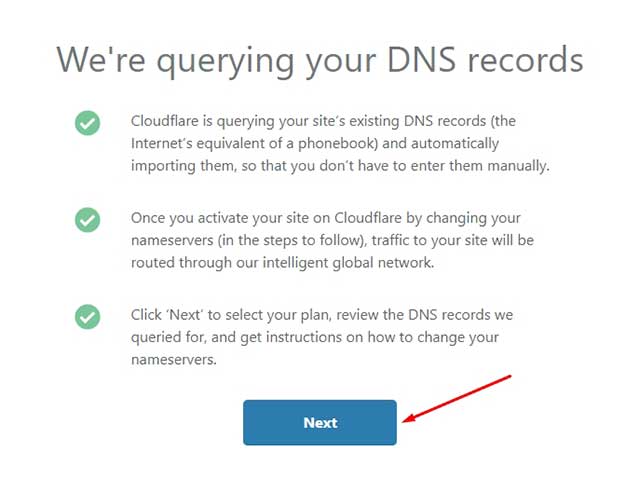 - Dejamos todo como esta y continuamos. Lo que sigue ahora es cambiar los servidores de nombre por los de Cloudflare. Para ello nos vamos a la administración DNS de nuestro dominio en mi caso en GoDaddy. Cambiar los predeterminados por los de Cloudflare, tal como se muestra en la imagen. Después presionar el botón «Continue«.