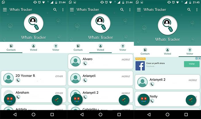 - Una vez que hayas realizado todo lo anterior lo siguiente que observaremos será la interfaz de la aplicación y en ella aparecen tres pestañas, de izquierda a derecha, en la primera pestaña encontraremos a todos nuestros contactos, en la segunda pestaña encontraremos los perfiles que tú has visitado y en la tercera y última pestaña encontraremos a todas las personas que han visitado nuestro perfil de WhatsApp.