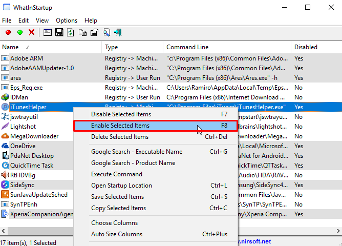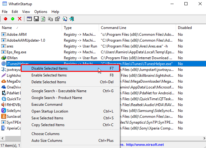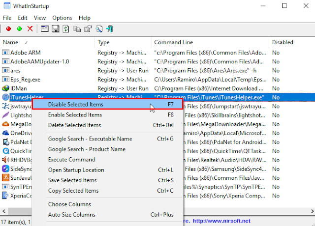 - Procede a ejecutar el ejecutable llamado WhatInStartup.exe, veras sus interfaz con el listado de todos los programas que se ejecutan al iniciar Windows 10. Para deshabilitar uno solo debes dar clic derecho y elegir «Disable Selected Items«, con esto deshabilitaremos el inicio de dio programa.