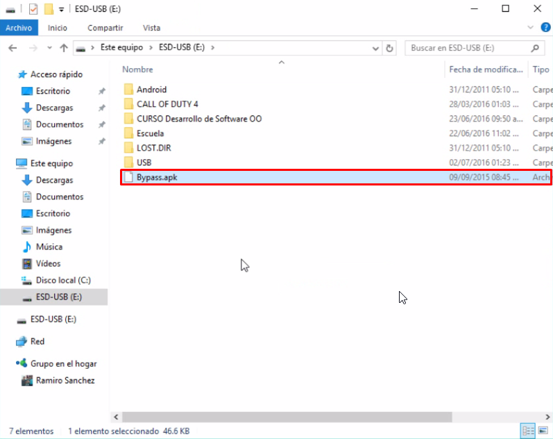 - Como primer paso debes descargar la aplicación Bypass.apk y copiarla en la raíz de tu memoria USB.