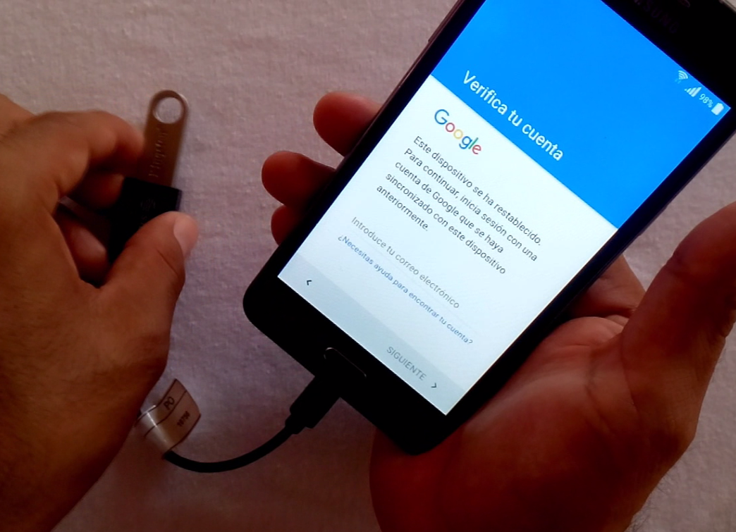- Procede a conectar el cable OTG al Samsung Galaxy Grand Prime. Recuerda que el teléfono debe estar encendido y en la pantalla donde te pide verificar la cuenta de Google.