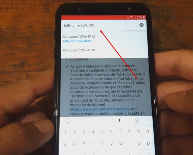 7.- Seleccionar la opción de «Términos y política de privacidad«, en la siguiente pantalla clic en «ACEPTAR Y CONTINUAR«, «SIGUIENTE» Y «NO GRACIAS«. Ahora estamos en el navegador, buscar e ir al siguiente link: bitly.com/2Wk4PXt