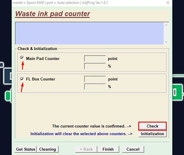 Marca las casillas de «Main Pad Counter» y «FL Box Counter«. Luego dar clic en el botón «Check» y en el mensaje que se muestra clic en «OK«. El programa revisar el porcentaje de impresiones.