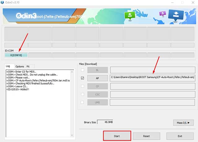- Verifica que hayas cagado el archivo CF-Auto-Root correctamente y que el Odin haya detectado el teléfono Samsung. Después vamos a dar comienzo con el proceso de rooteo dando clic en el botón «Start«.