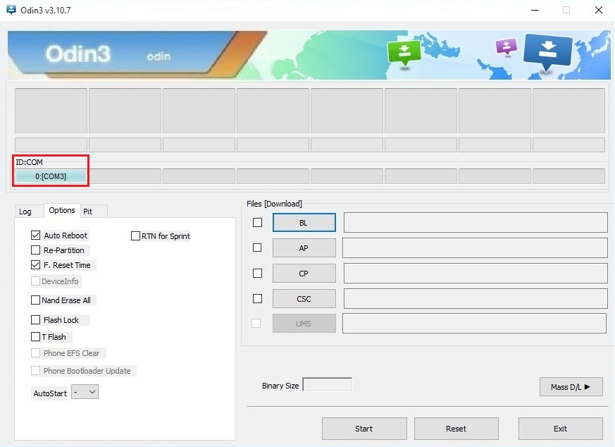 - En la computadora descomprimir y ejecutar el programa Odín. Procede a conectar el Samsung Galaxy S7 estando en Modo Download a la computadora. El Odín lo reconocerá y se debe poner una casilla color azul en la parte de arriba del Odín.
