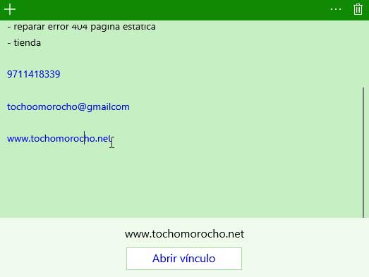 Sticky Notes tiene sus propias funciones muy útiles que le dan un plus a esta aplicación de notas, cuando escribes un número de teléfono, un correo electrónico, o una url de un sitio te detectara de forma automática las opciones especiales para cada caso.