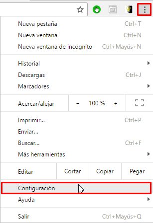 - Lo primero que hay que hacer es abrir nuestro navegador Google Chrome y acceder a la opción de «Configuración» que se encuentra dando clic sobre el botón de los 3 puntos en la parte superior derecha del navegador.