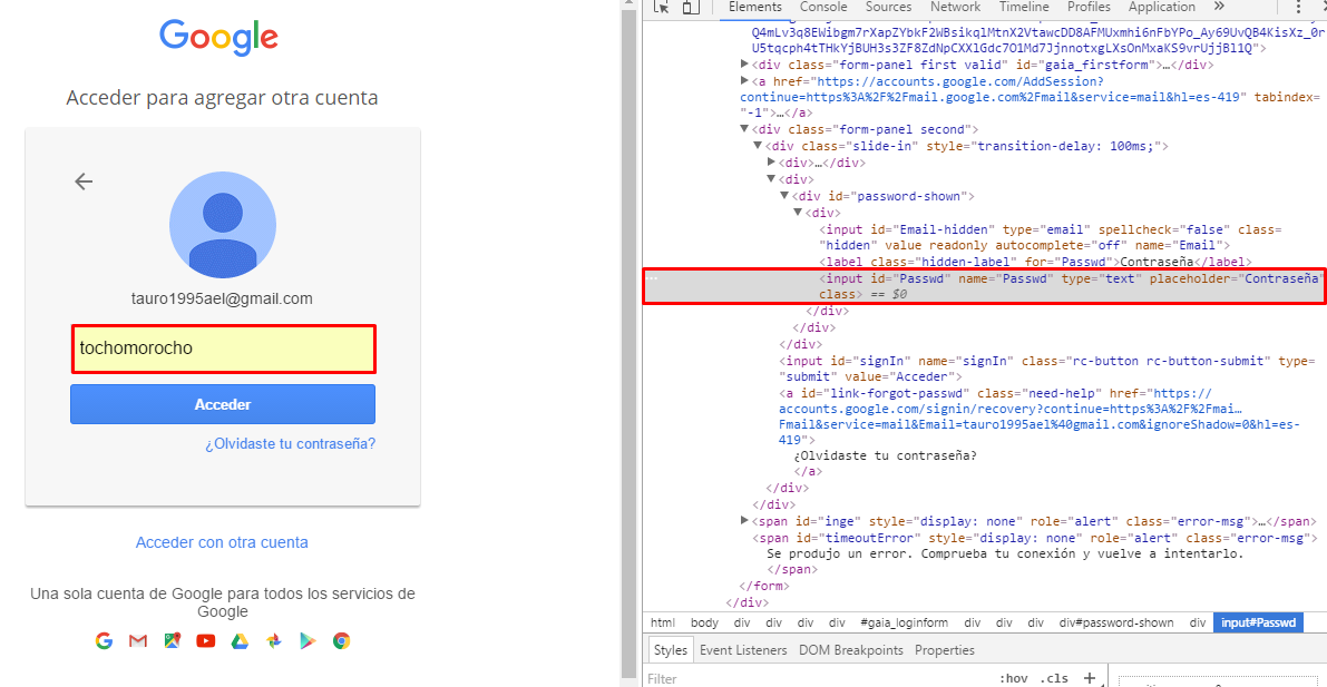- En este momento ya podrás ver la contraseña que se ocultaba bajo los asteriscos. Puedes jugar con esa propiedad cambiando password por text y viceversa.