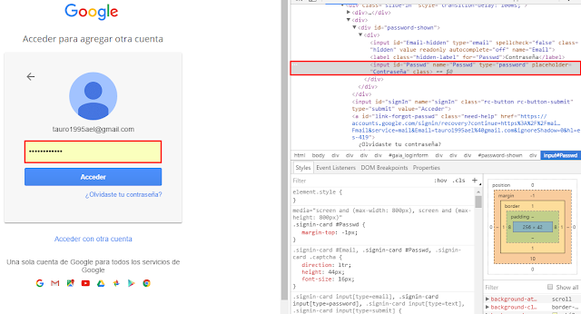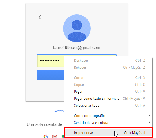 - Lo primero que hay que hacer es acceder a alguna página en la cual tengamos guardada alguna contraseña, para este tutorial lo vamos hacer en la página de Gmail.com y nos ubicamos en la casilla de contraseña, dar clic derecho y seleccionar «inspeccionar» o «inspeccionar elemento«.